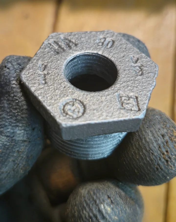 1 - ¾ x ¼ inch bushing. We will send the conduit with the lamp wire out of the lamp through this. You may need to drill the hole out a bit to get the ⅜ inch tubing to fit through it. You can also substitute this for a black iron plug but you’ll have to drill the hole from scratch with this.