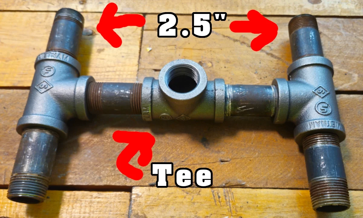 Attach a 2.5 inch nipple to the 2 outlet sides of one tee. For now leave the top part of the tee empty. Then attach the inlets of the other 2 tees to the 2.5 inch nipples that we attached to the outlet of the first tee.